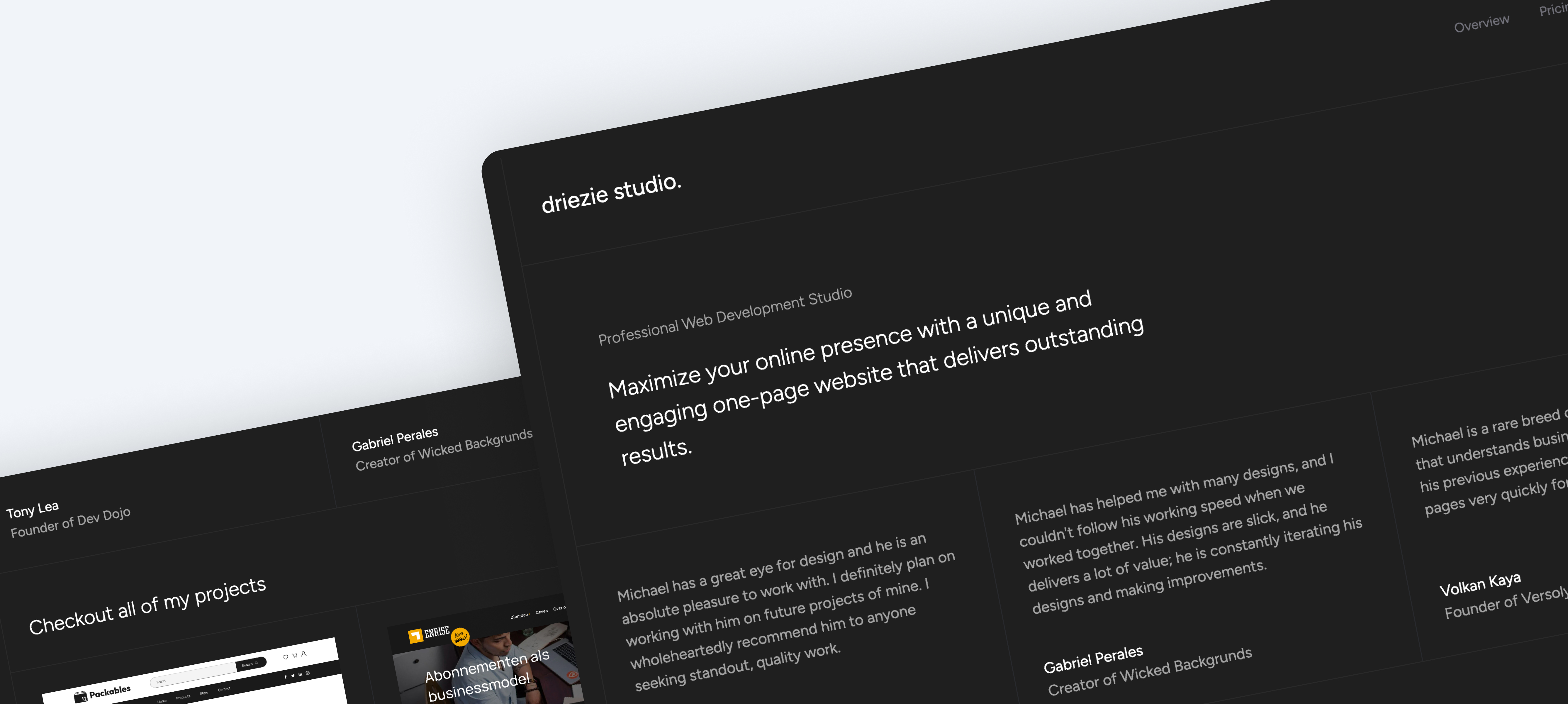 Driezie Studio is a one-person operation, offering personalized attention and direct communication throughout the project. As a student in the Netherlands, I'm passionate about delivering accessible, responsive, and user-friendly websites for brands, agencies, and non-profit organizations.