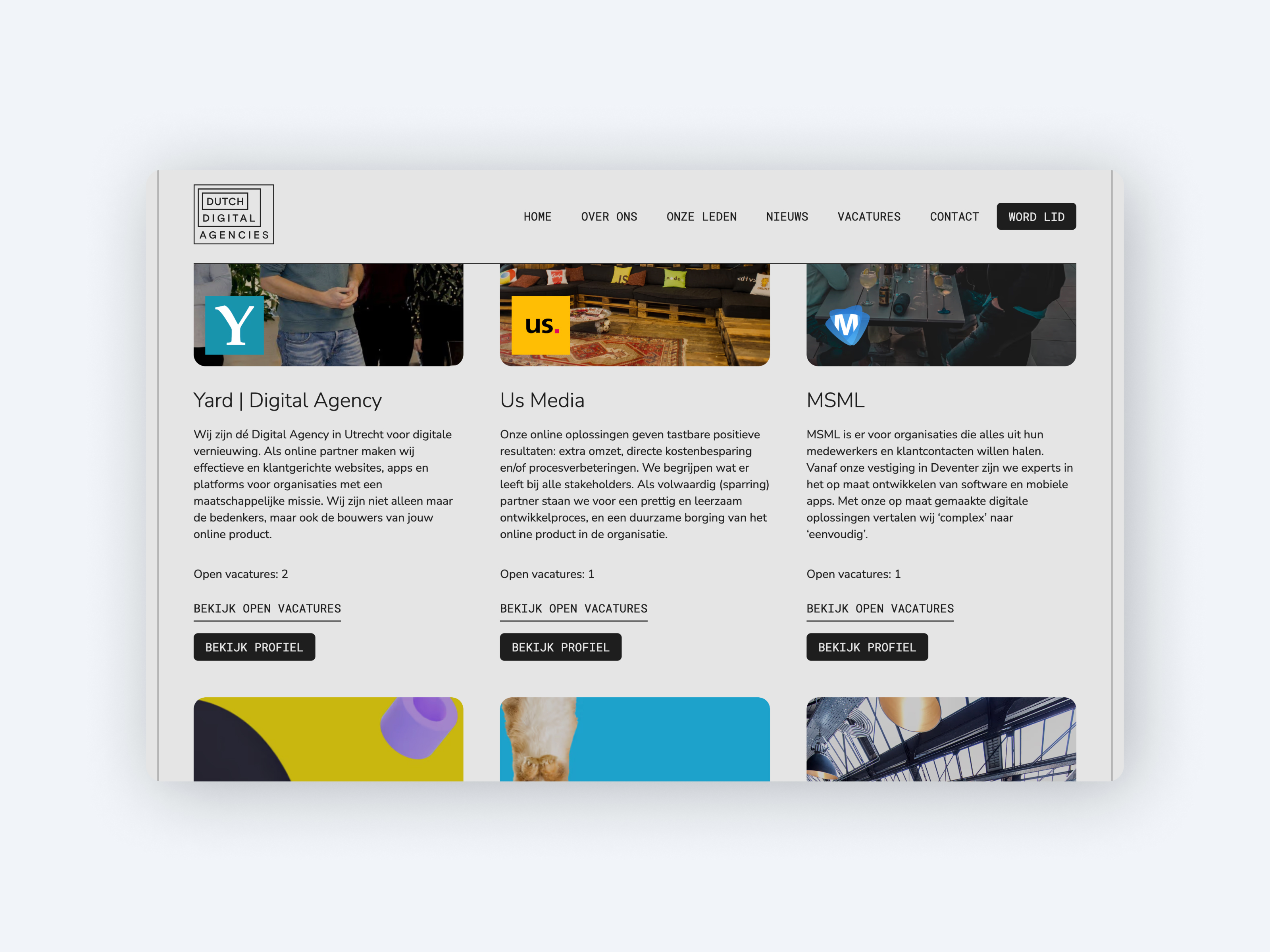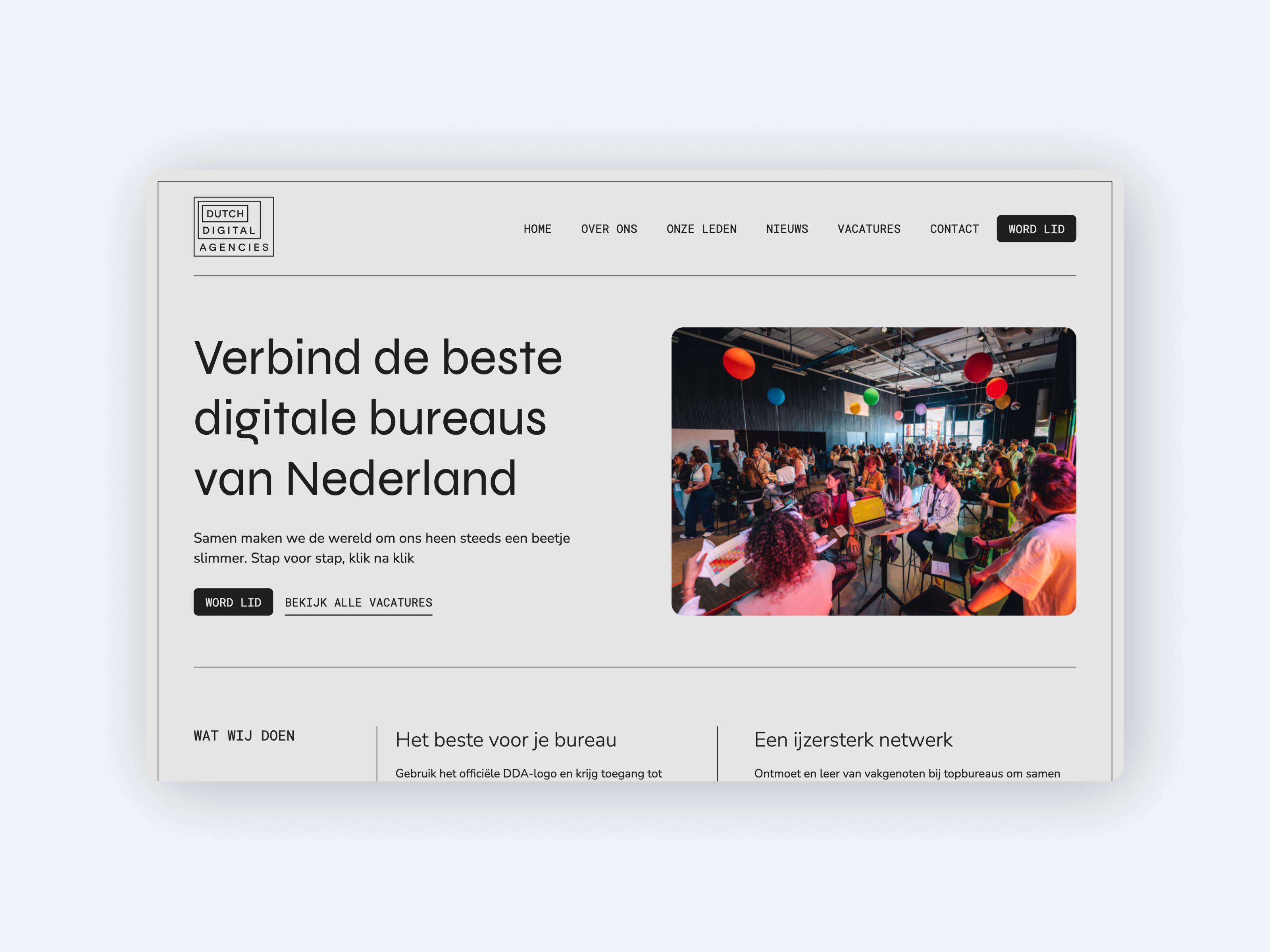 Digitale bureaus helpen bedrijven en publieke instellingen om hun gebruikers beter van dienst te zijn. Met een app bijvoorbeeld, of een digitaal platform. En daar begint het pas. Want we blijven verslimmen. Met nog handigere knoppen, een persoonlijker inlogscherm of nieuwe functionaliteiten, altijd gebaseerd op de nieuwste technologieën. Al deze stappen en stapjes zorgen voor vooruitgang waarmee miljoenen Nederlanders elke dag hun voordeel doen. Van een bank-app tot een dating-app en van een datagedreven verzekering tot een digitale zorgverlener.